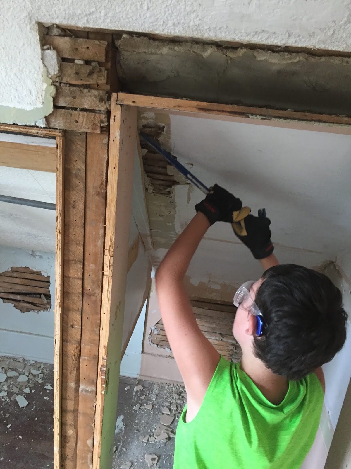 Erin has made great progress painting Kristian's room. She showed it to us today via FaceTime. We'll get pictures for next week! Her garden is producing lots of tomatoes, lettuce and peas, along with a few cucumbers. The cucumber vines seem to have picked up a leaf fungus, and we don't know whether anything can be done about it. I've suffered with that in my garden back in Thunder Bay, also. Kristian has been doing great work here with us. He likes using the hammer to knock off the plaster and lath. He's also pretty good with the gooseneck taking structures apart!